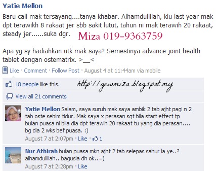 Konsisten amalkan vitamin cadangan ni insyaalah kita semua dapat berpuasa penuh dan bersolat terawih dengan cukup tahun ni. Bonus menarik menanti anda, kulit makin cantik dan badan makin slim di pagi raya. Confirm saudara mara dan kawan-kawan puji perubahan anda. Best kan, dapat buat ibadat dengan sempurna dan sambil mencantikkan diri. 2 dalam 1 gitu ;)